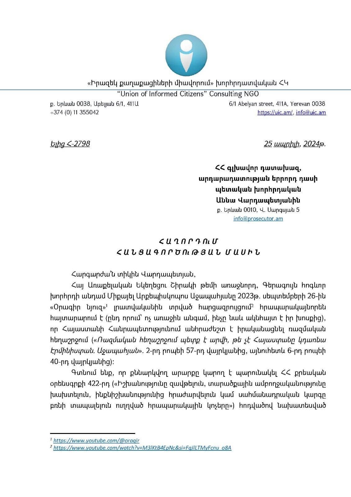 Միքայել Արքեպիսկոպոս Աջապահյանի` ռազմական հեղաշրջման կոչի դեպքով հանցագործության մասին հաղորդում ներկայացրել ենք դեռ անցած տարի։ Այն ժամանակ մեզ մերժեցին` պնդելով, որ հանցակազմ չկա։ Հիմա ասում են, որ հանցակազմ կա։