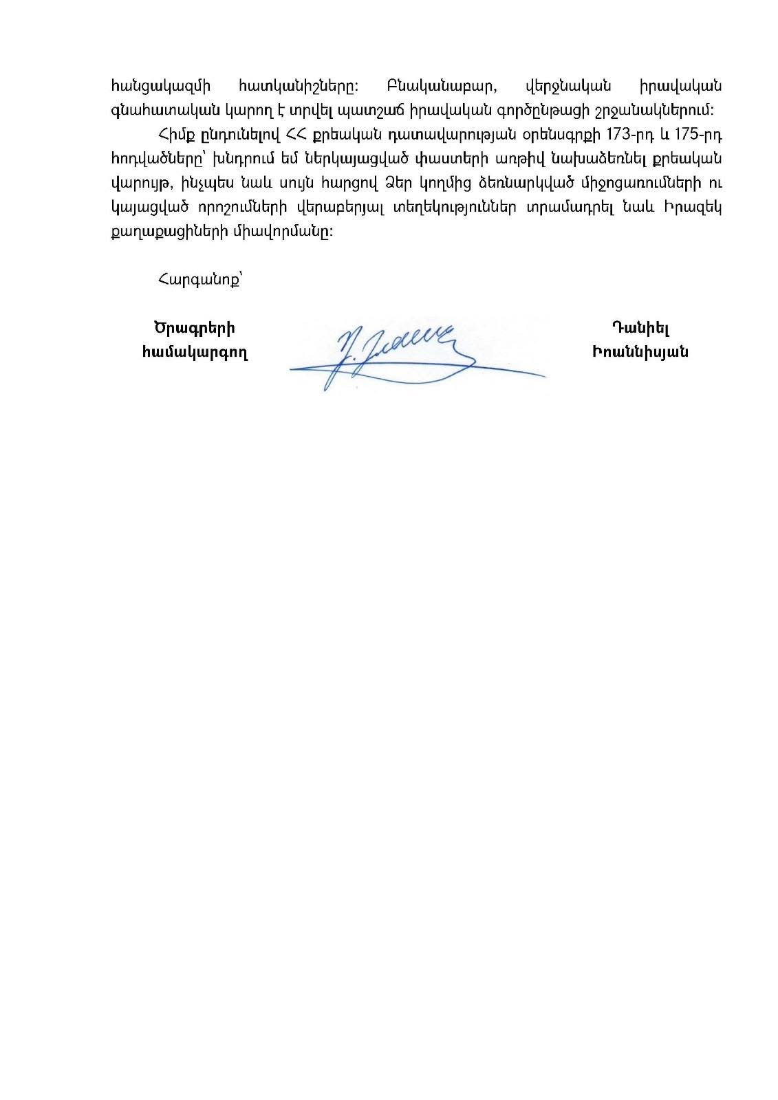 Հ.Գ. Աջապահյանի պաշպաններին կփոխանցենք այս փաստաթղթերը, թող օգտագործեն` հետապնդման մեջ քաղաքական մոտիվների առկայությունը հիմնավորելու համար։