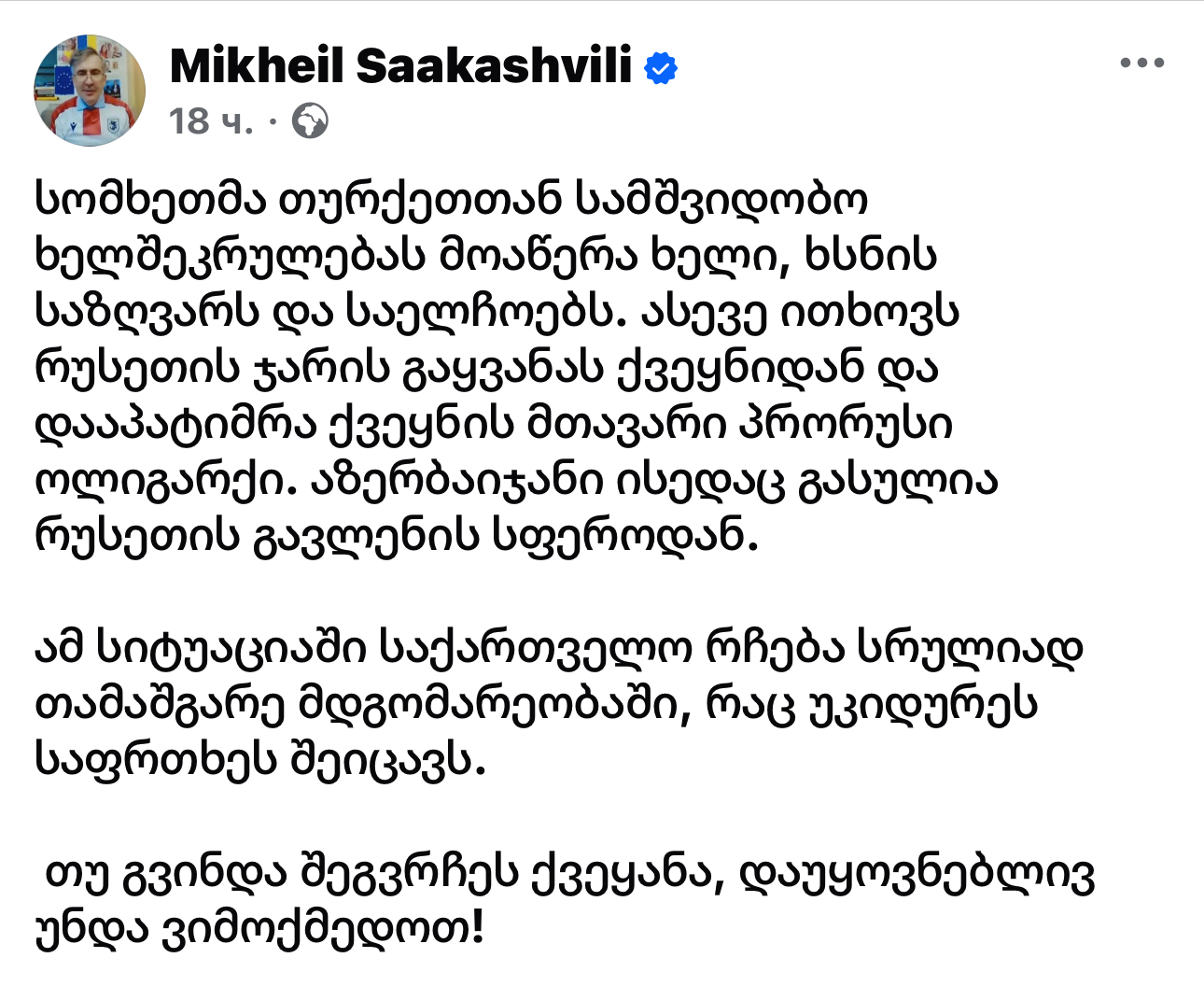 Վրաստանի նախկին նախագահ Միխեիլ Սաակաշվիլին հայտնում է, թե Հայաստանը Թուրքիայի հետ փաստաթուղթ է ստորագրել.