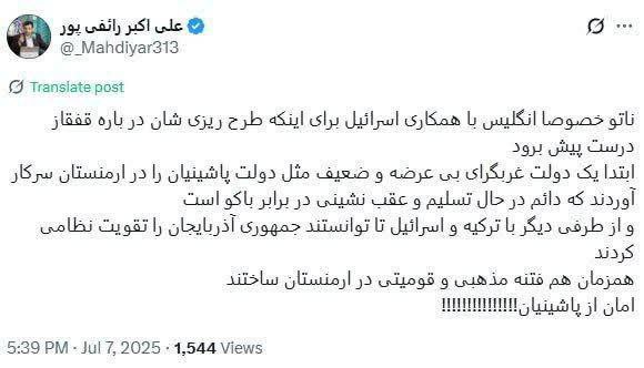 Իրանի Իսլամական Հանրապետության առաջնորդին մոտ կանգնած վերլուծաբան Ալի Աքբար Ռաեֆիպուրը իր X էջում գրում է.