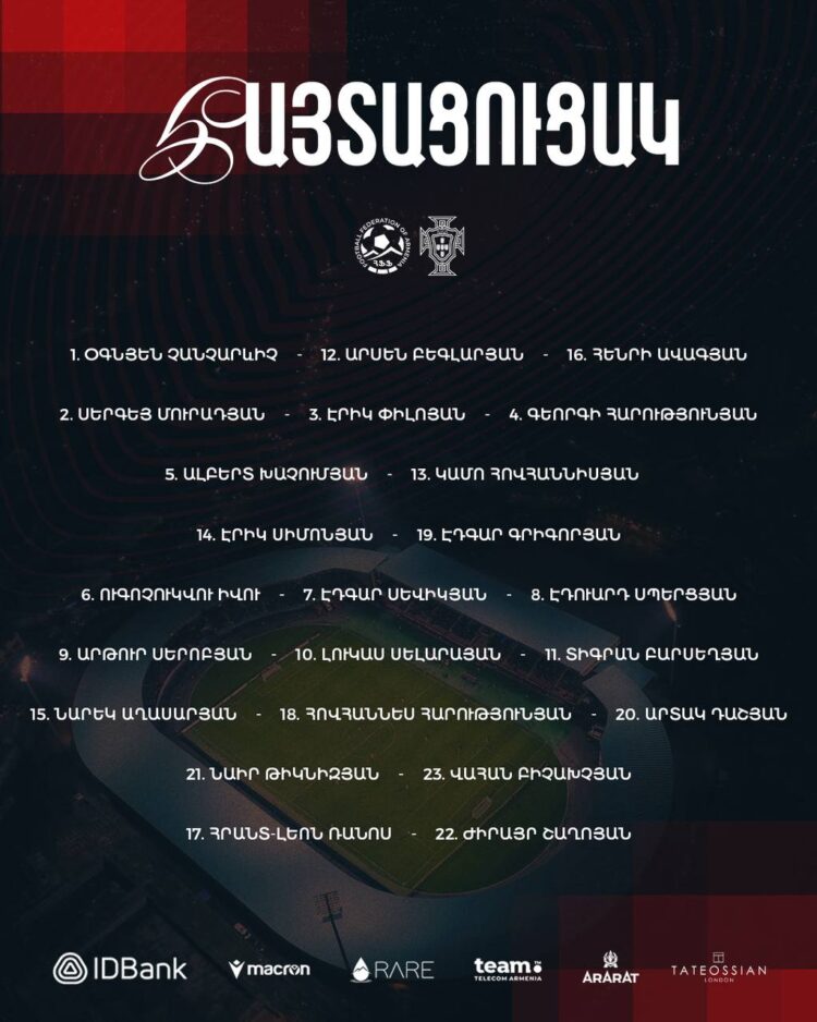 ՀՖՖ մամուլի ծառայությունը հրապարակել է Հայաստանի ազգային հավաքականի հայտացուցակը ԱԱ-2026-ի եվրոպական գոտու որակավորման փուլի F խմբի առաջին տուրում Պորտուգալիայի դեմ խաղի համար: