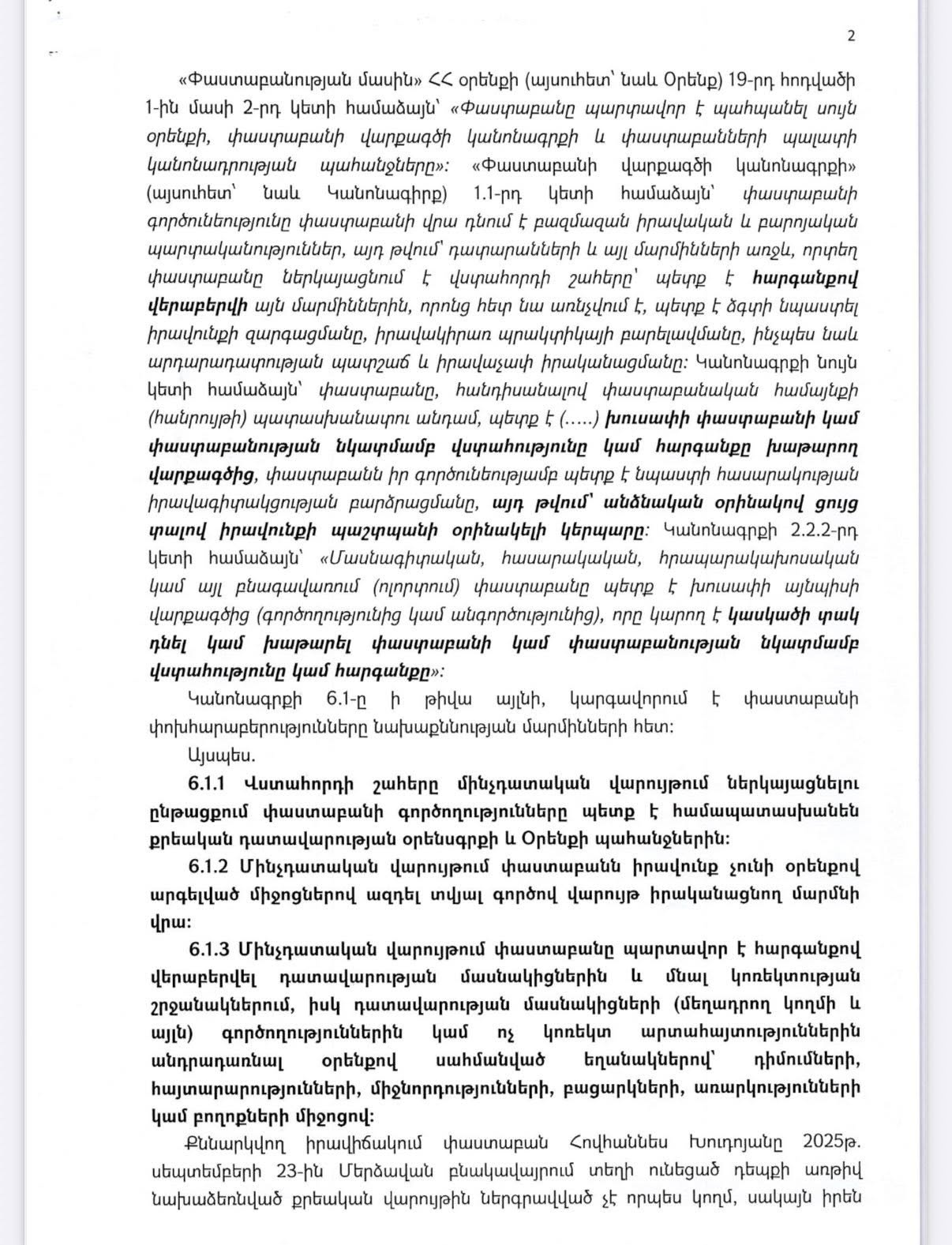 Երկու օր առաջ ստացել եմ ծանուցում ՀՀ փաստաբանների պալատից, որ իմ վերաբերյալ ներկայացվել է կարգապահական վարույթ հարուցելու հաղորդում: Այս մասին գրել է փաստաբան Հովհաննես Խուդոյանը: