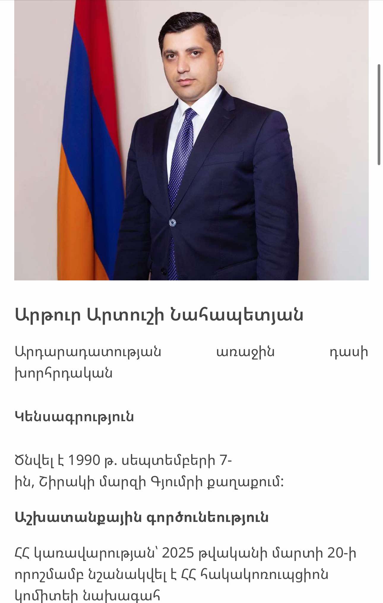 Եվ երրորդը․ Հակակաոռուպցիոն կոմիտեի նախագահը գյումերիցիների մասին կարծրատիպ է կոտրում․ գյումրեցի Արթուր Նահապետյանը պատրաստ է պատկառելի տարիքի մարդուն գետնին փռել տալ, շպրտել Գյումրու քաղաքապետարանի շենքից, թե հանուն ինչի, հայտնի է բոլորին։