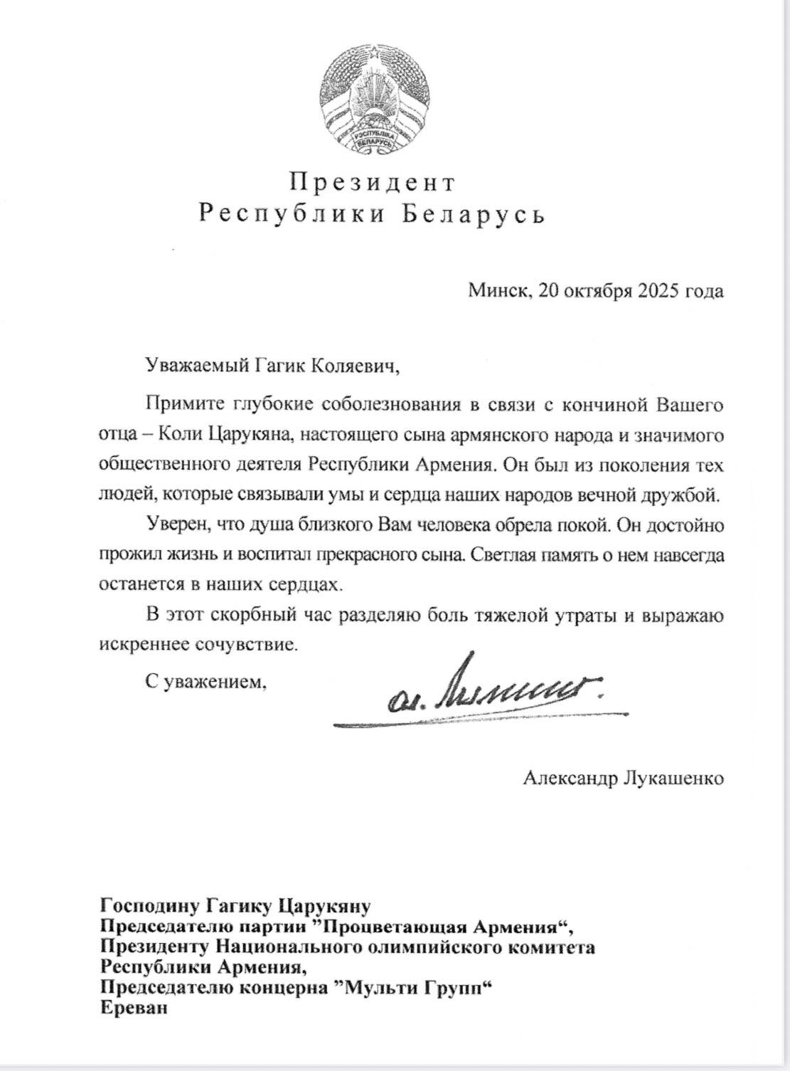 Բելառուսի Հանրապետության նախագահ Ալեքսանդր Լուկաշենկոյի ցավակցական ուղերձում մասնավորապես նշված է․