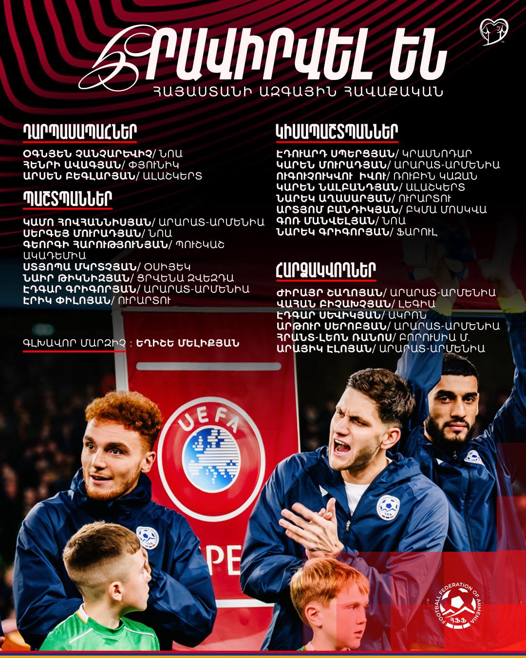 Հրապարակվել է Հայաստանի ազգային հավաքական հրավիրված խաղացողների ցանկը: Այս մասին հայտնում են ՀՖՖ-ից: