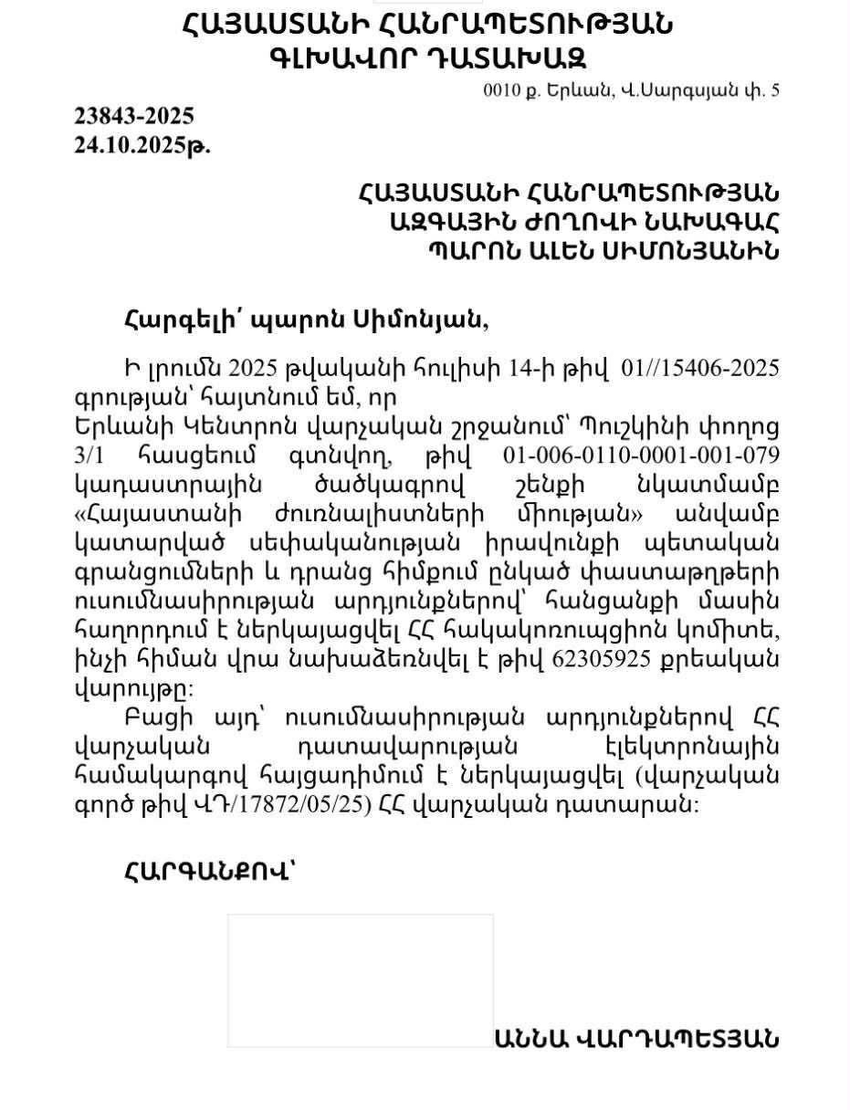 Գլխավոր դատախազությունից տեղեկացա, որ կառույցն ընթացք է տվել ամիսներ առաջ իմ և ԱԺ նախագահ Ալեն Սիմոնյանի ուղարկած նամակին։